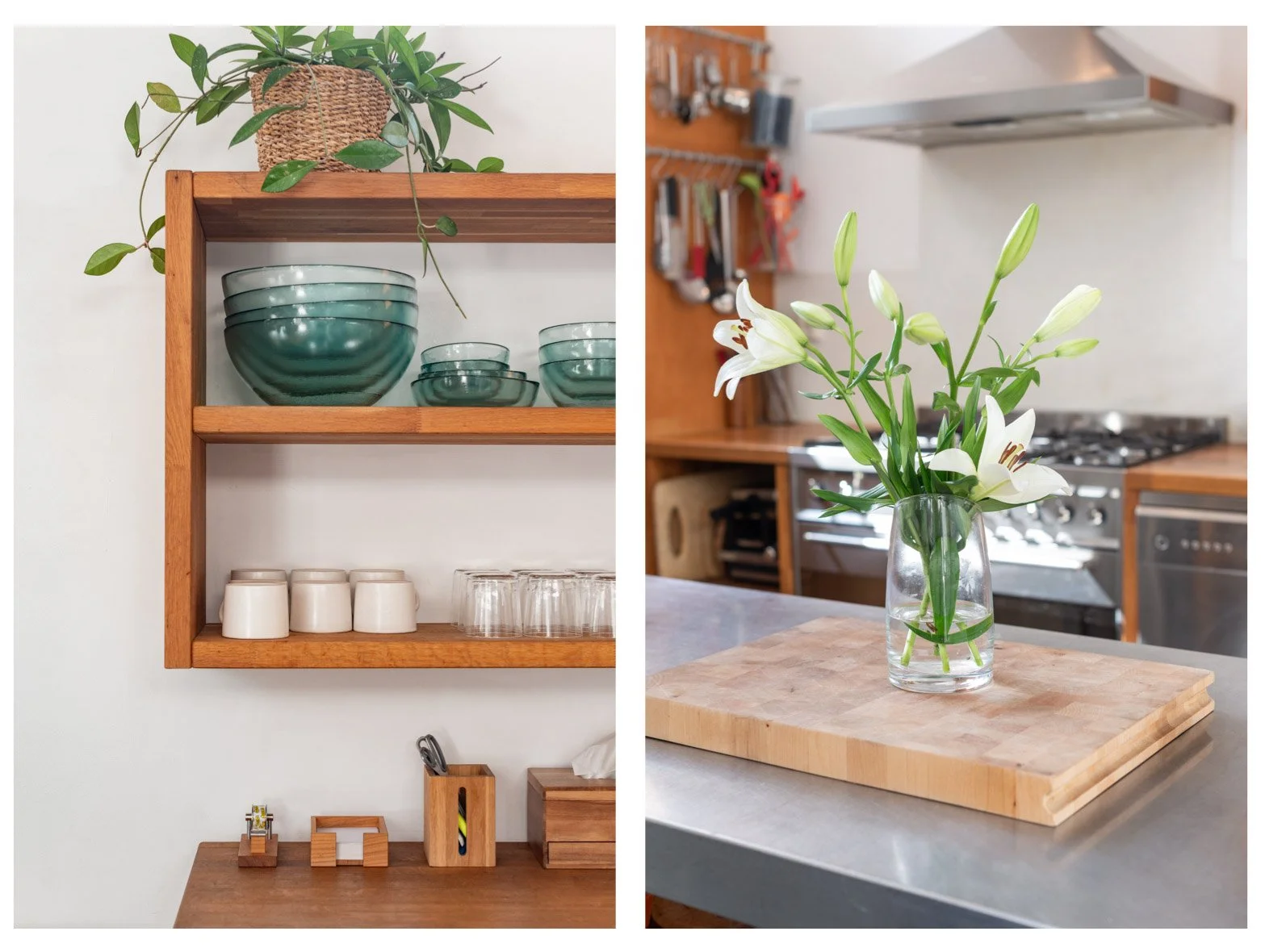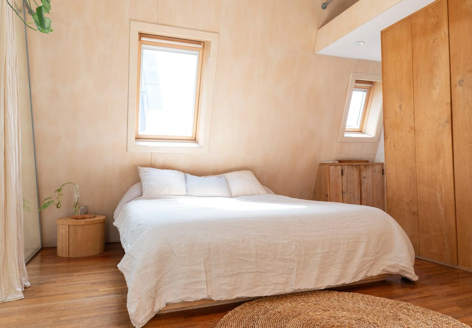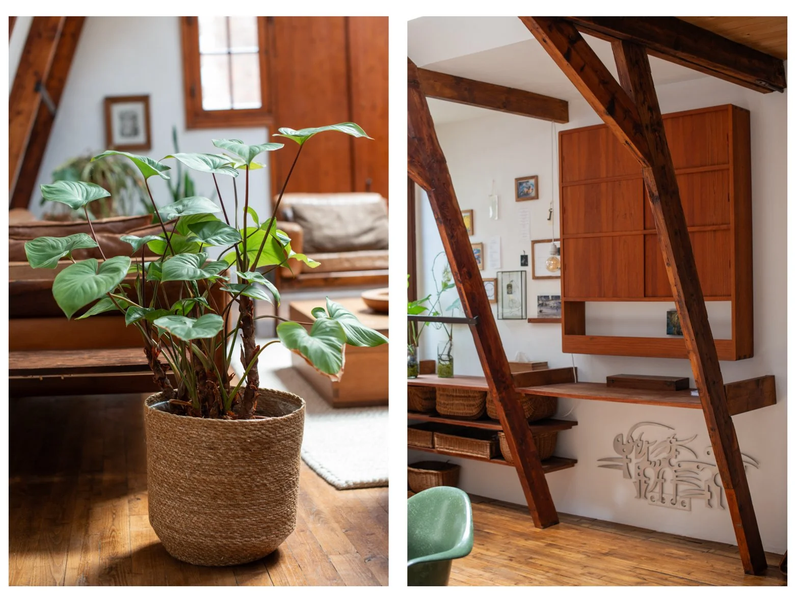The house is fully furnished with mid-century modern design furniture and tasteful contemporary elements, which match the chestnut-wood floors, and exposed original wood beams. A wood-burning stove, comfortable leather couches and deep-pile carpets provide a warm, homey aesthetic. The home has been featured in design and architecture magazines.